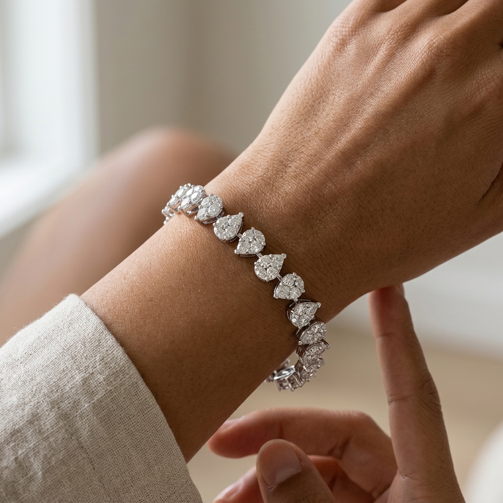 This exquisite 18k White Gold bracelet, adorned with natural diamonds, is a statement of grace and refinement. A classic yet striking piece, designed to elevate every moment with quiet sophistication.